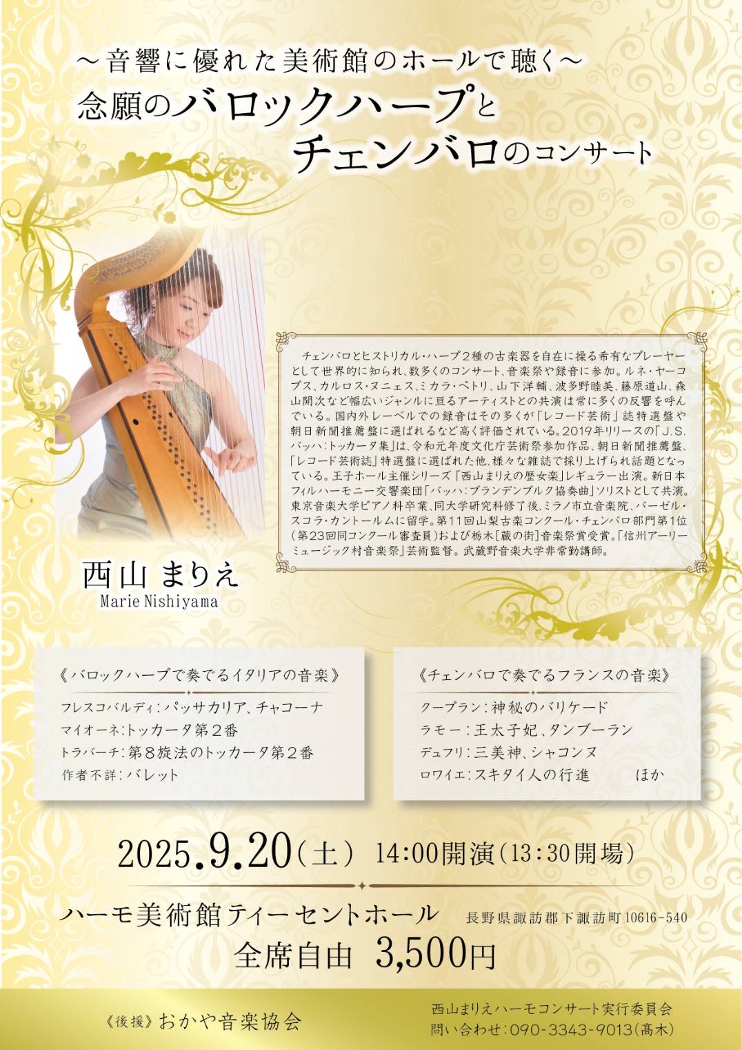 諏訪湖畔、遠く富士山も見える美しい景勝のハーモ美術館。ティーセントホールは音響に優れ、古楽器がヨーロッパの教会や大きなサロンのように聴こえます。おかや音楽協会の多大なるサポートのもと、チェンバロ&ハープ奏者・西山まりえが両楽器を演奏します。遥か昔のヨーロッパに思いを馳せながら、どうぞご堪能ください。