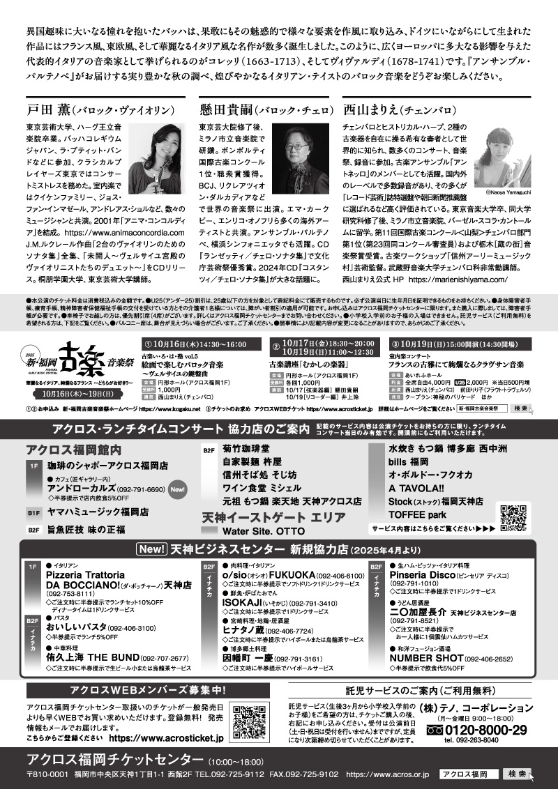 新・福岡古楽音楽祭 2025|秋の豊穣イタリア・バロック名曲選 バッハとイタリア 華麗な技巧と煌めく和声|アクロス福岡 福岡シンフォニーホール|アンサンブル・パルテノぺ 懸田貴嗣 戸田薫 西山まりえ