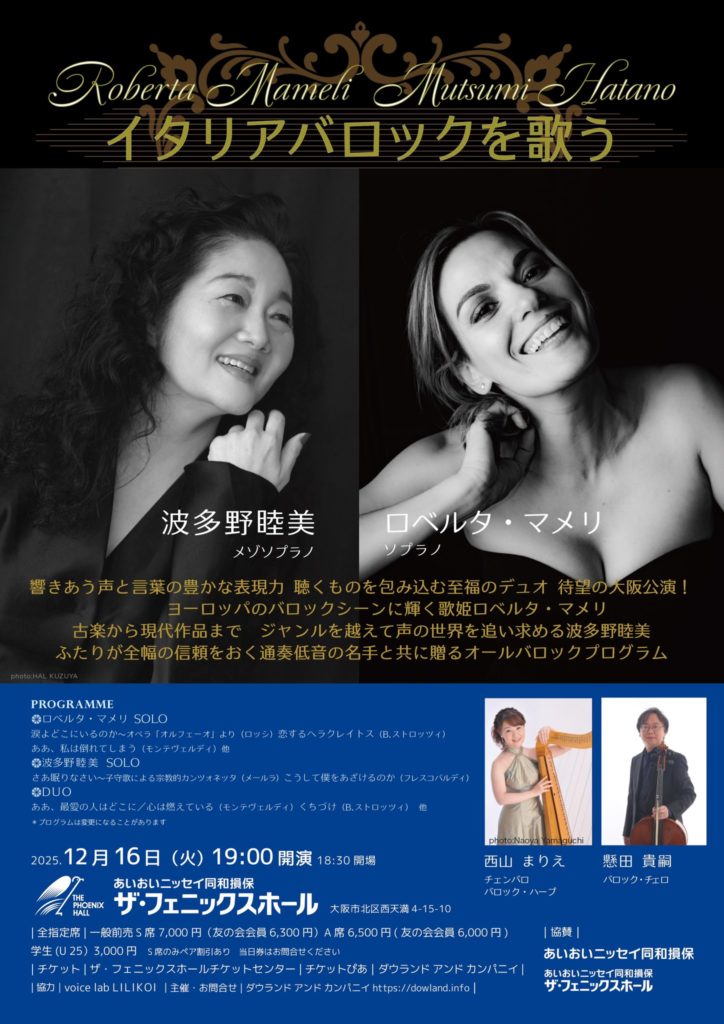 響きあう声と言葉の豊かな表現力 聴くものを包み込む至福のデュオ 待望の大阪公演!ヨーロッパのバロックシーンに輝く歌姫ロベルタ・マメリ 古楽から現代作品までジャンルを越えて声の世界を追い求める波多野睦美 ふたりが全幅の信頼をおく通奏低音の名手と共に贈るオールバロックプログラム。