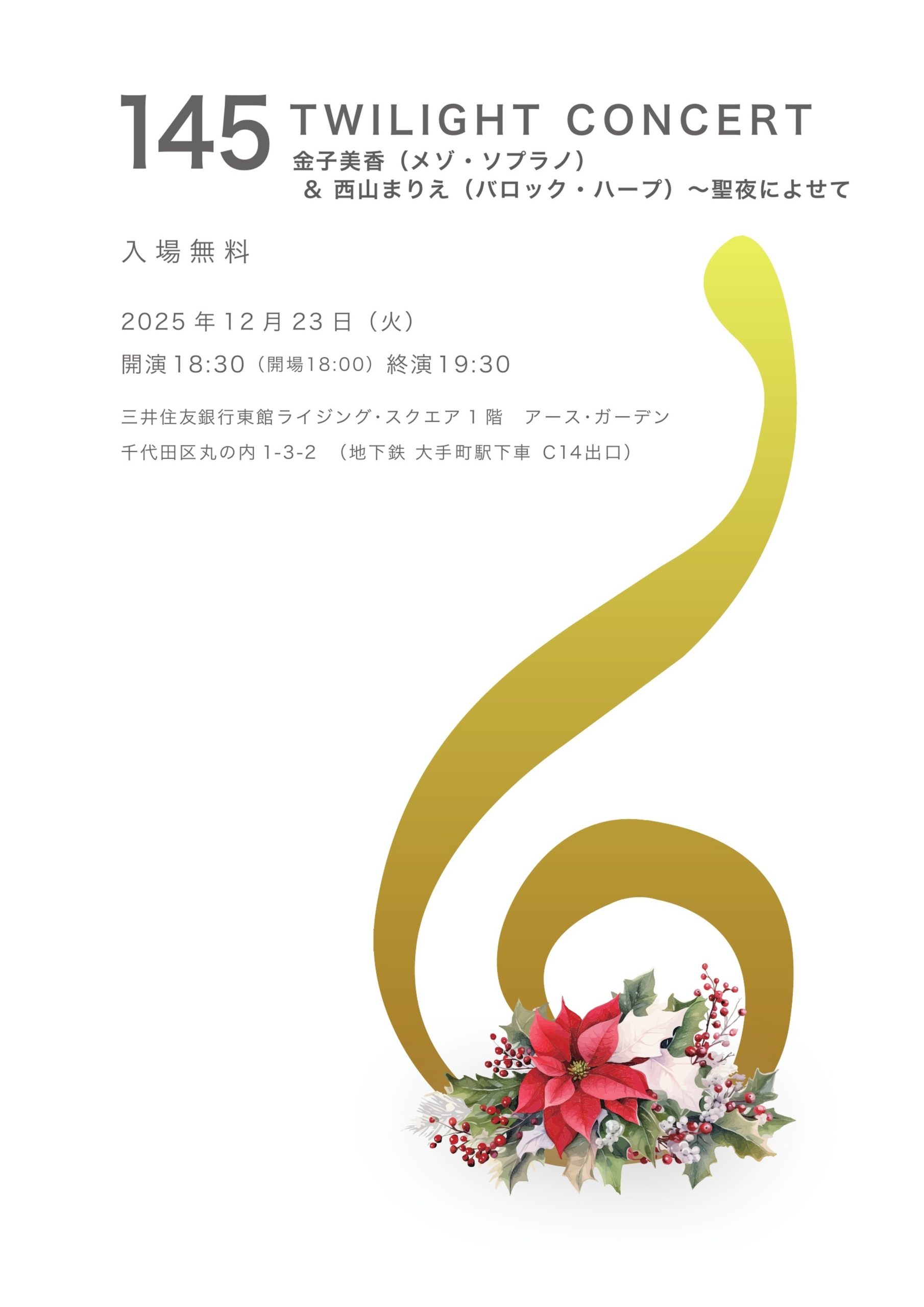 トワイライトコンサート 145 聖夜によせて|金子美香 西山まりえ|大手町 三井住友銀行東館ライジング・スクエア1階|入場無料|無料配信あり