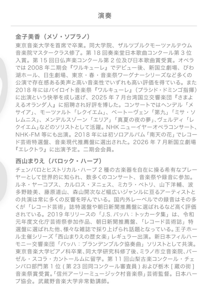 - 金子美香(メゾ・ソプラノ)西山まりえ(バロック・ハープ)