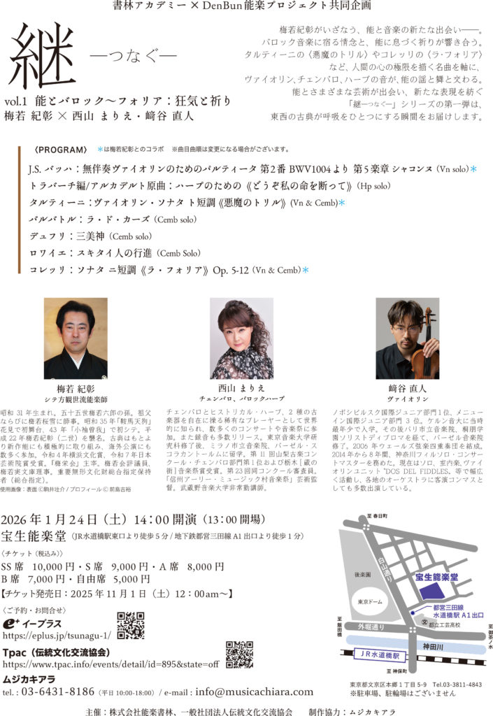梅若紀彰がいざなう、能と音楽の新たな出会い。バロック音楽に宿る情念と、能に息づく祈りが響き合う。タルティーニの『悪魔のトリル』やコレッリの『ラ・フォリア』など、人間の心の極限を描く名曲を軸に、ヴァイオリン、チェンバロ、ハープの音が、能の謡と舞と交わる。能とさまざまな芸術が出会い、新たな表現を紡ぐ。「継ーつなぐー」シリーズの第一弾は、東西の古典が呼吸をひとつにする瞬間をお届けします。