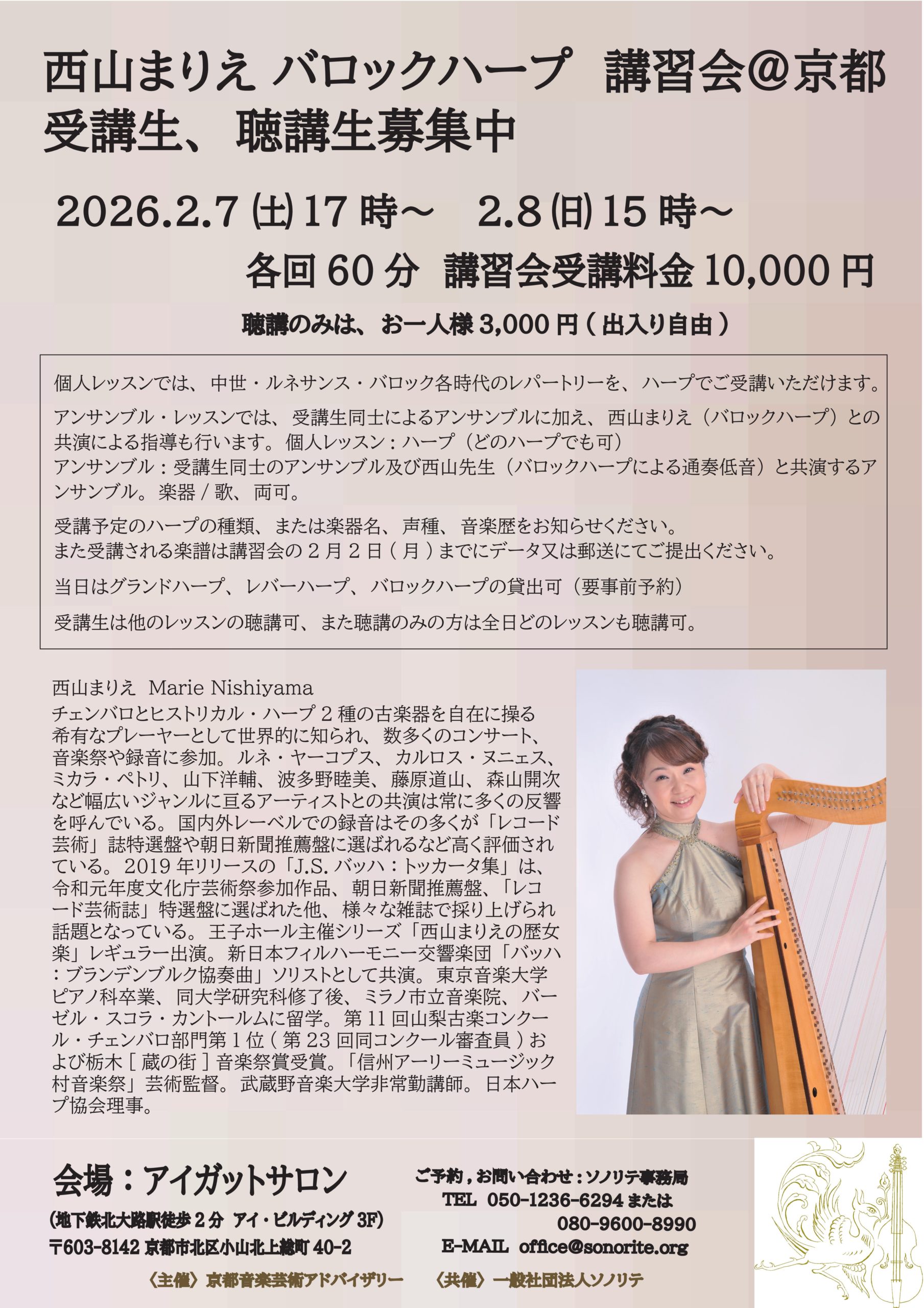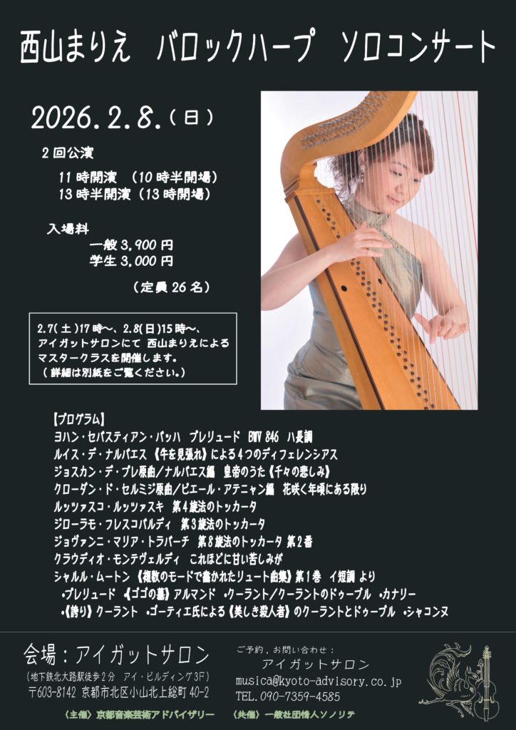 西山まりえ バロックハープ ソロコンサート|マスタークラス|バッハ フレスコバルディ モンテヴェルディ シャルル・ムートンなど|京都・アイガットサロン