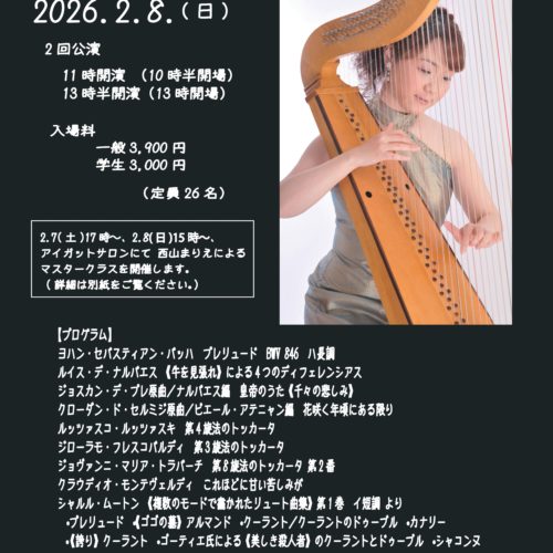 - 西山まりえ(バロック・ハープ)マスタークラスはアンサンブル、西山先生による通奏低音付き受講も可